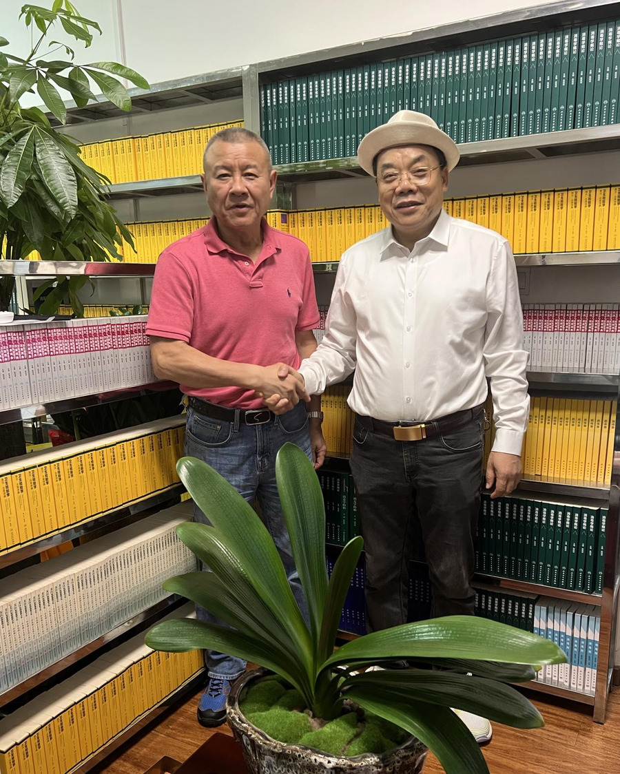 【生医】【华验】董事长陈昭斌教授(右)在【华验】自己的书房向美国著名化学教授杨洪博士(左)介绍自己在学术方面所取得的成就