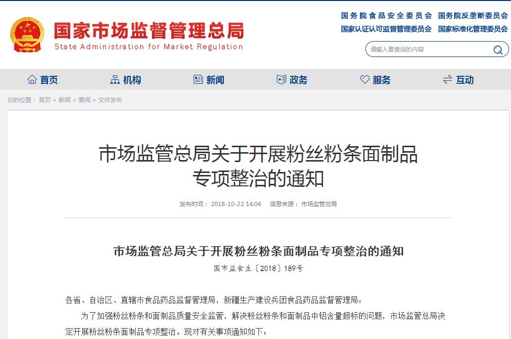 据市场监管总局网站消息,市场监管总局近日发布关于开展粉丝粉条面制品专项整治的通知。通知指出,各地食品安全监管部门要督促生产经营者严格按照食品安全法等法律法规及相关标准组织生产经营,落实企业主体责任,开展全面自查,粉丝粉条获证生产企业确保粉丝粉条中铝的残留量控制在≤200mg/kg。